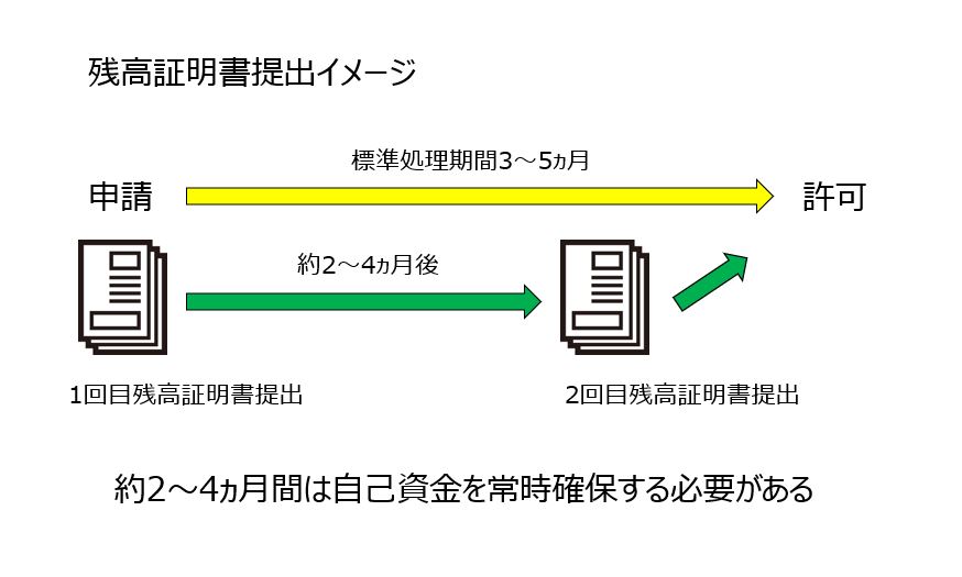 申請時に自己資金を確保していることを証明するために残高証明書等を提出し、かつその自己資金を許可が出るまでの間常時確保していなければなりません。