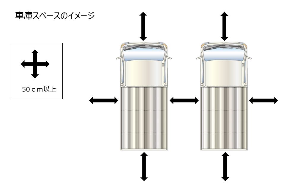 車両と車庫の境界及び車両相互間の間隔が50センチメートル以上確保され、かつ、計画車両数すべてを収容できるものであることという基準が設けられています。